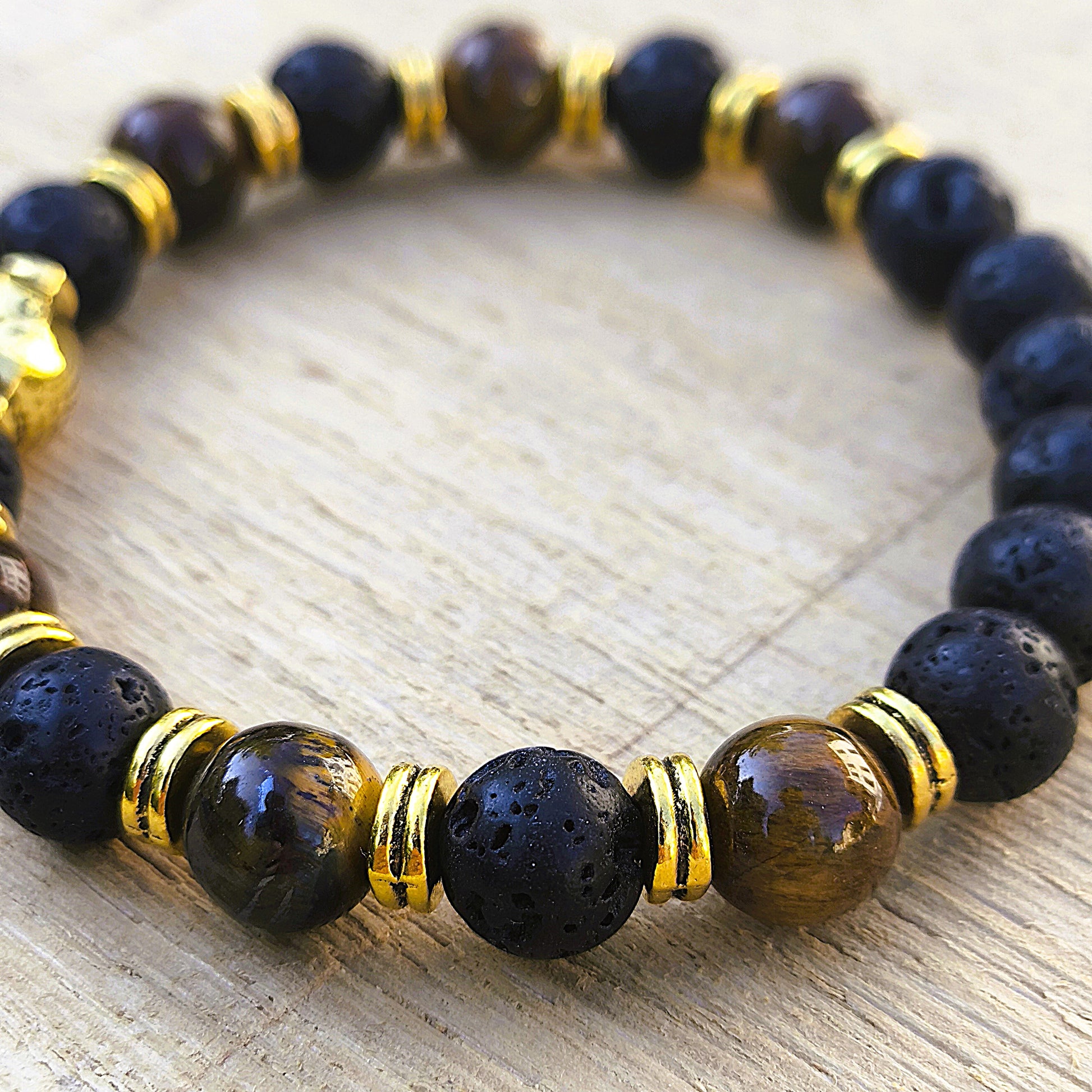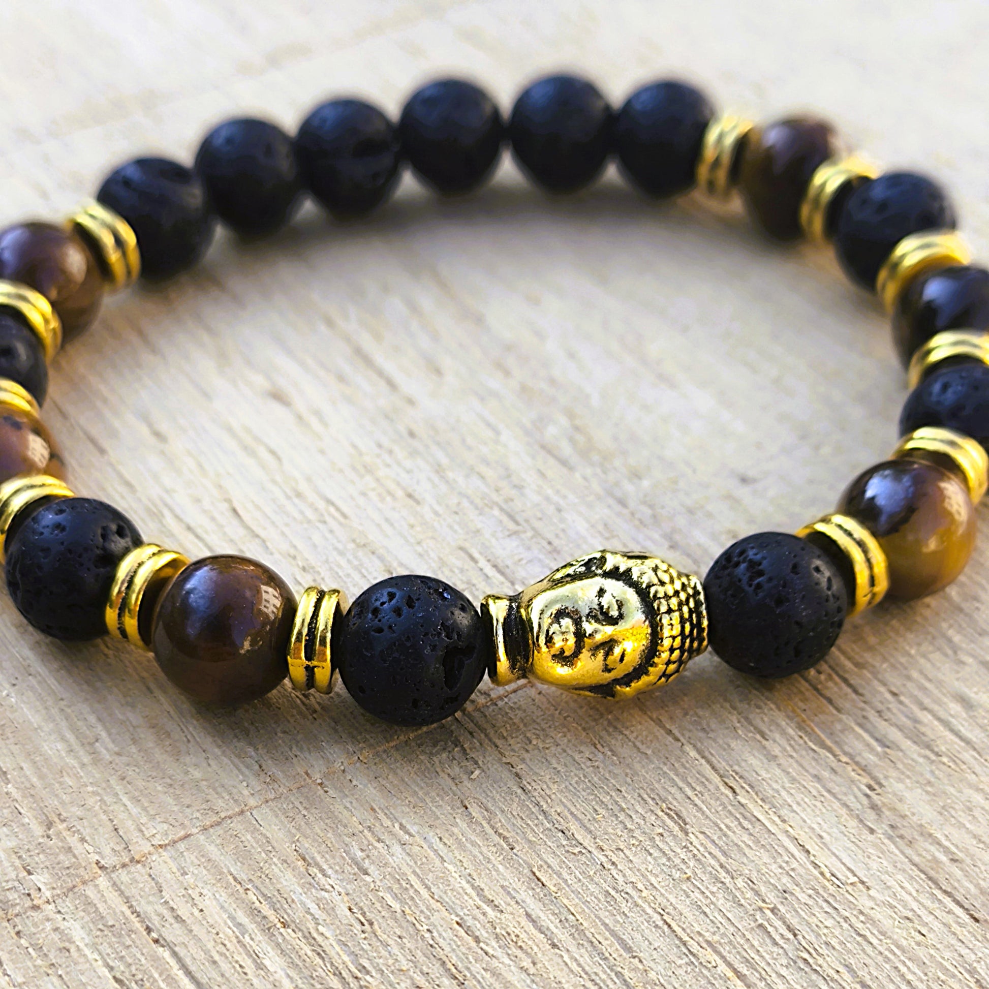 Dieses handgefertigte Armband vereint Lavagestein, Tigerauge und ein goldenes Buddha-Element zu einem stilvollen Symbol für Achtsamkeit, Erdung und Selbstvertrauen.